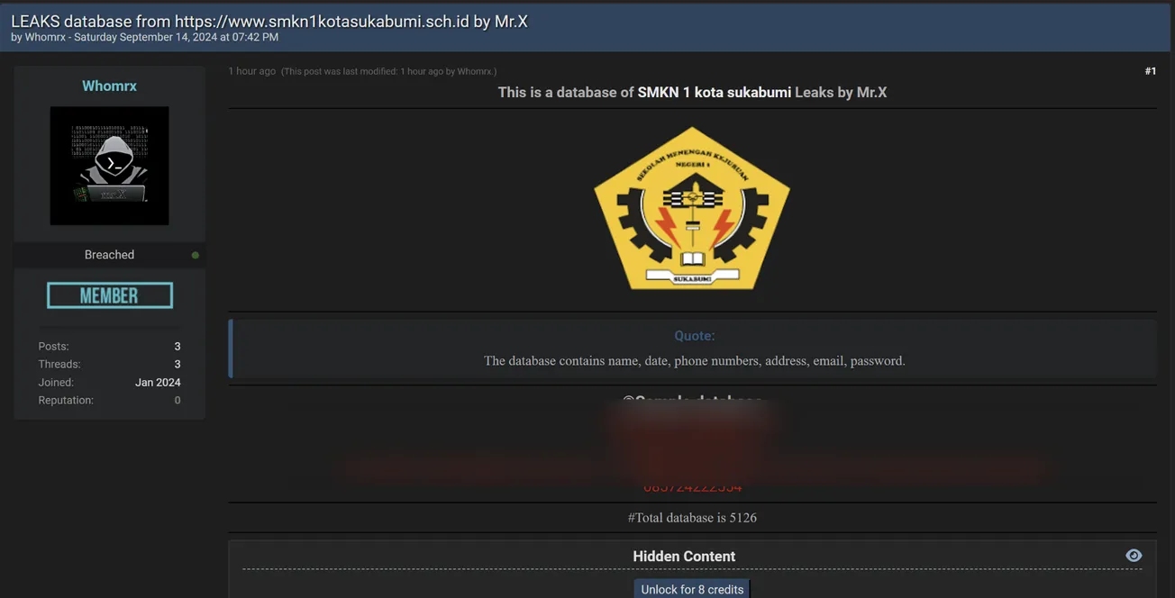 🚨A Threat Actor has Allegedly Leaked the Database of SMK Negeri 1 Kota Sukabumi