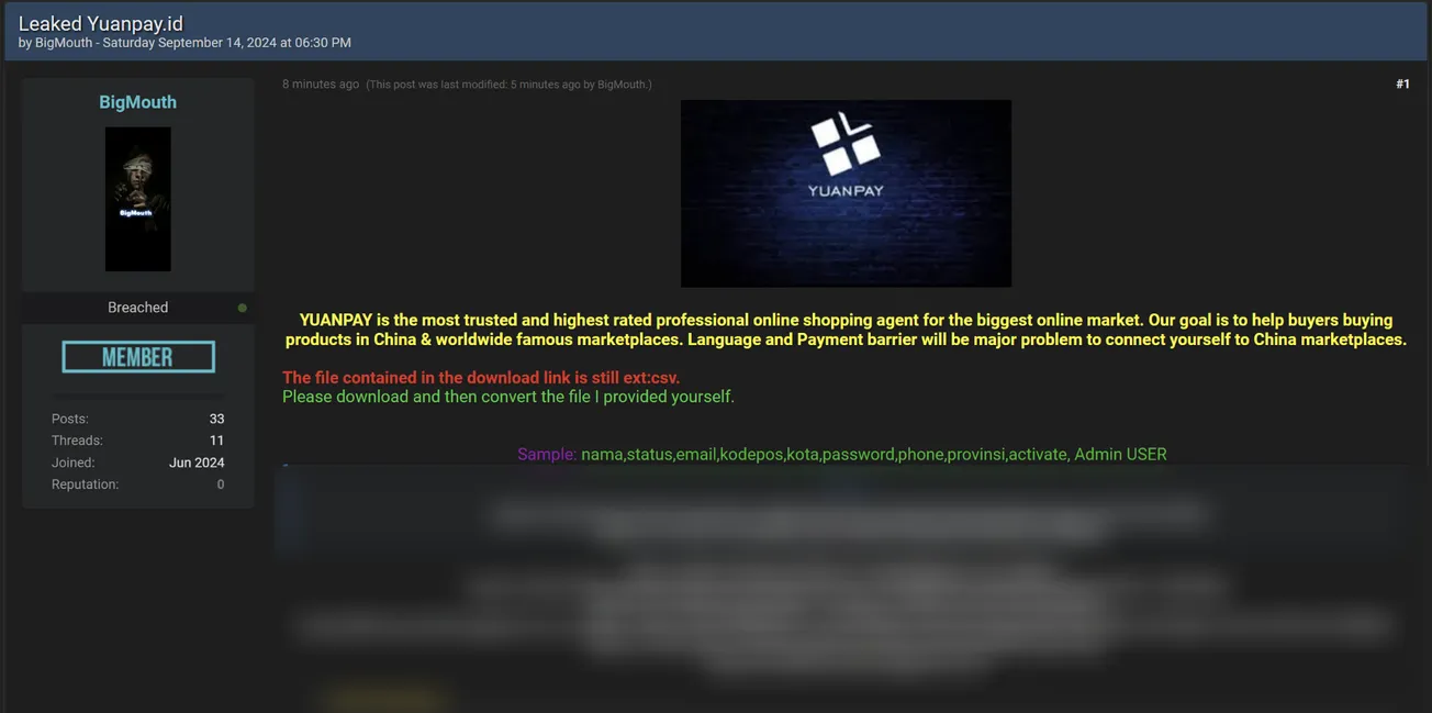 A Threat Actor has Allegedly Leaked the Database of Yuanpay Indonesia