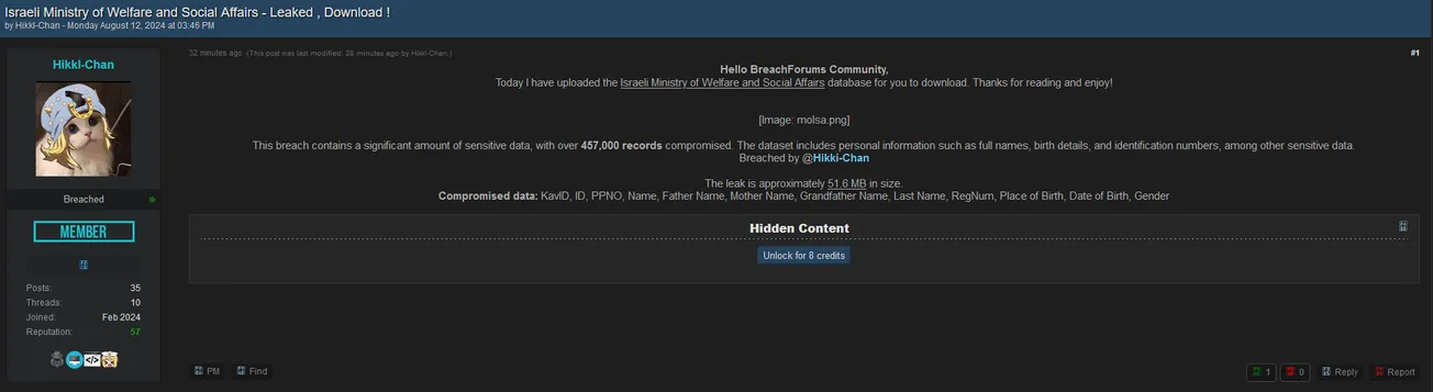 A Threat Actor Has Allegedly Leaked the Database to the Israeli Ministry of Welfare and Social Affairs