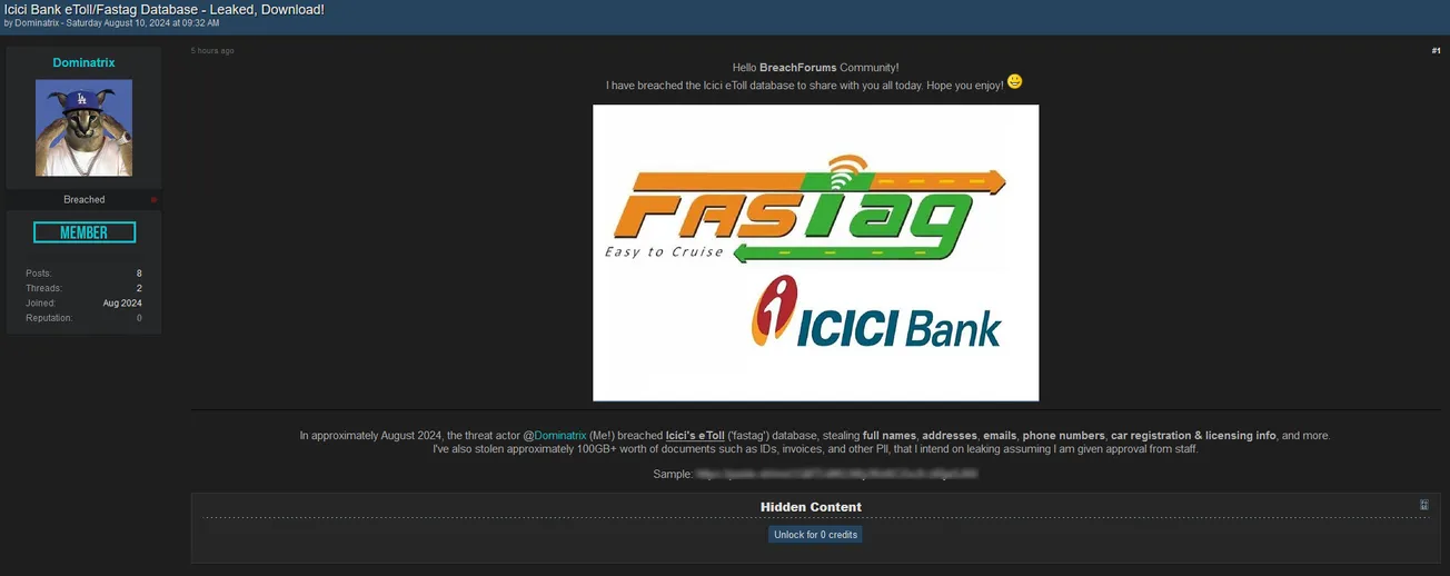 A Threat Actor Has Allegedly Leaked the Icici Bank eToll/Fastag Database