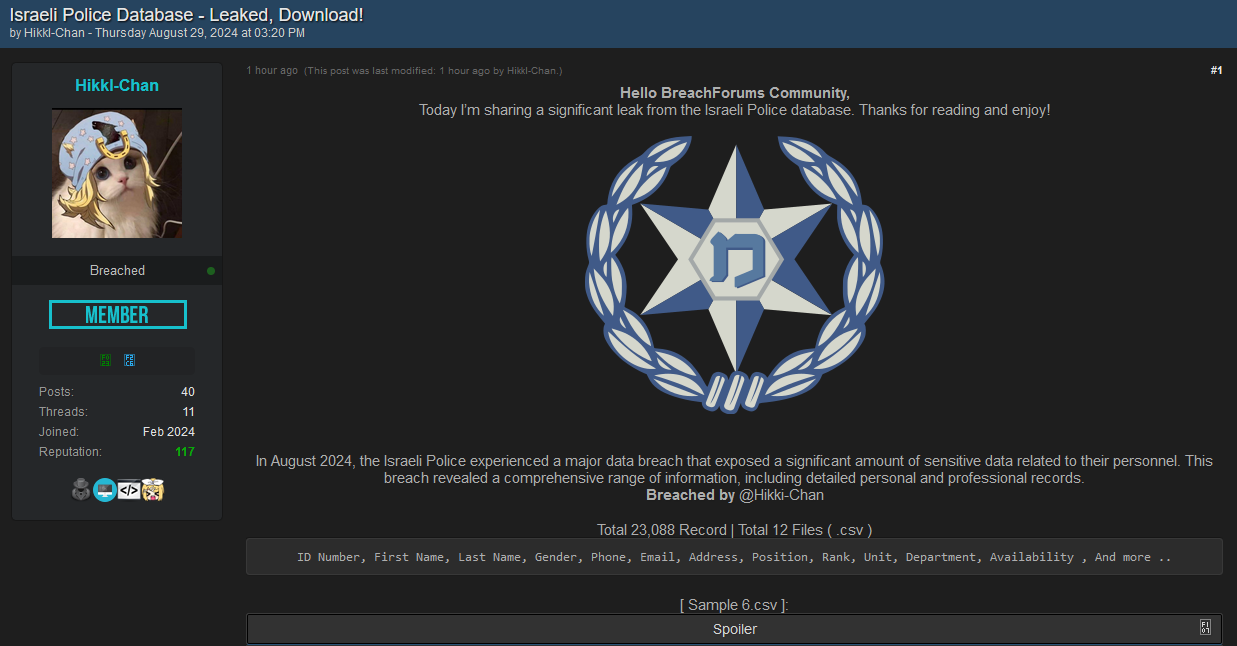 In August 2024, the Israeli Police experienced a major data breach that exposed a significant amount of sensitive data related to their personnel. This breach revealed a comprehensive range of information, including detailed personal and professional records.