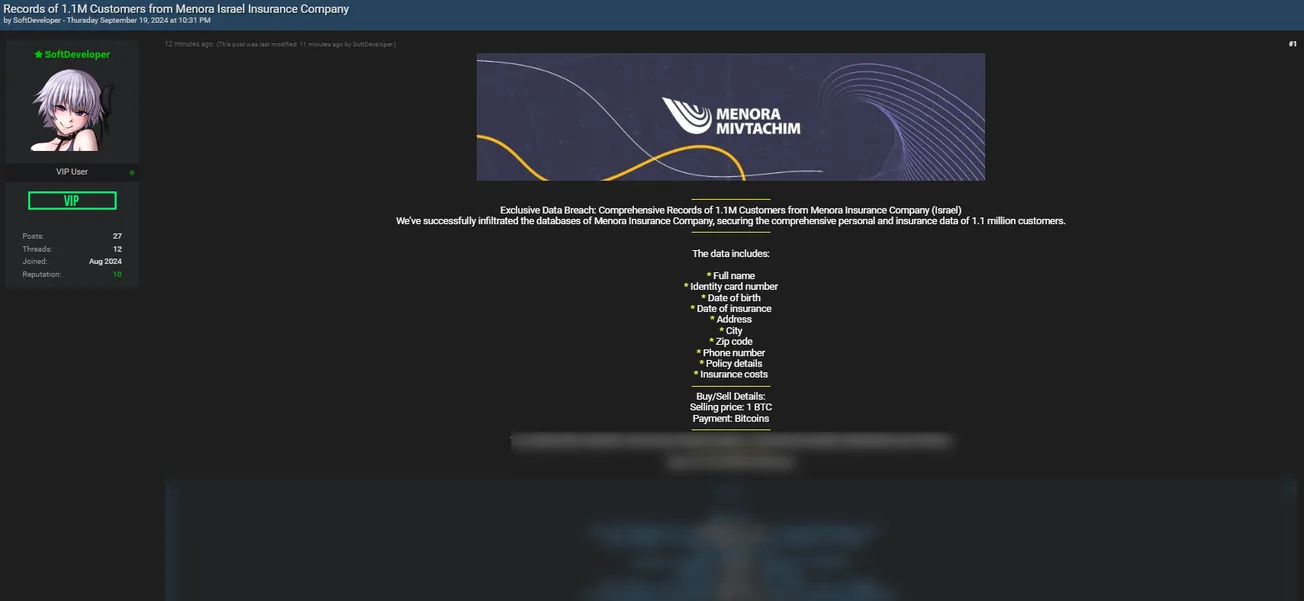 A Threat Actor is Allegedly Selling 1.1 Million Records to Menora Mivtachim
