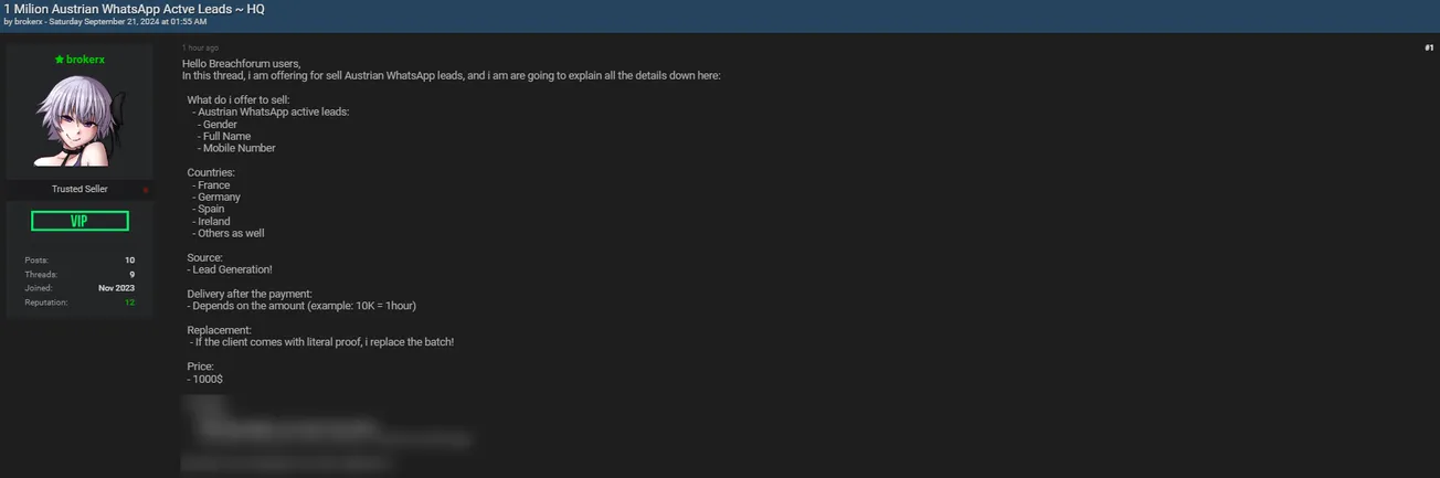 🚨 Title: Alleged sale of 1 million Whatsapp leads