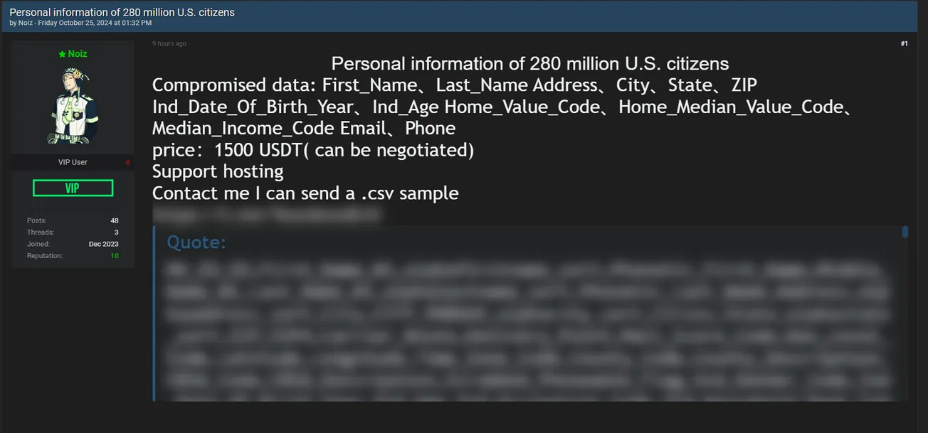 A Threat Actor is Allegedly Selling 280 Million USA Citizen's Data