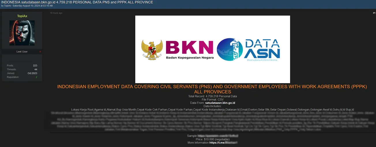 A Threat Actor is Allegedly Selling 4,759,218 Lines of Data Belonging to Badan Kepegawaian Negara (BKN)
