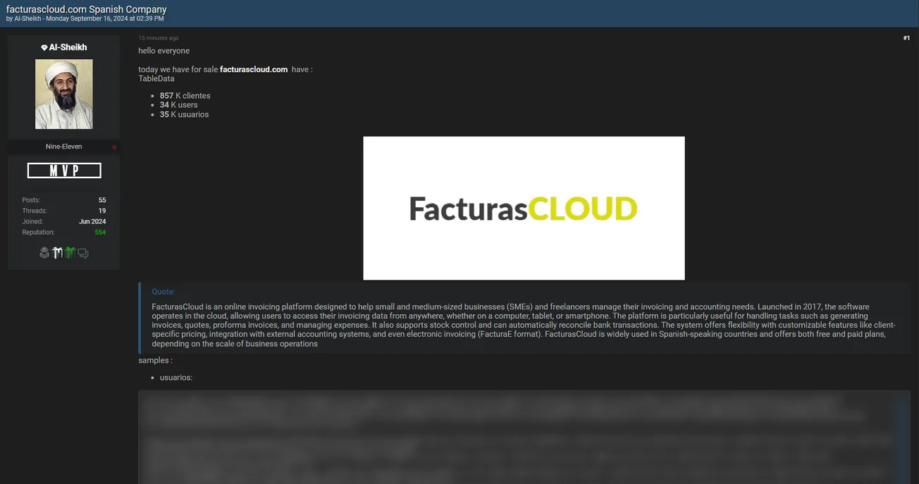 🚨 Title: Alleged sale of Facturas Cloud database