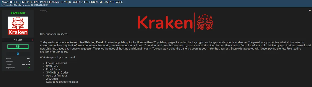 A Threat Actor is Allegedly Selling a Kraken Live Phishing Panel