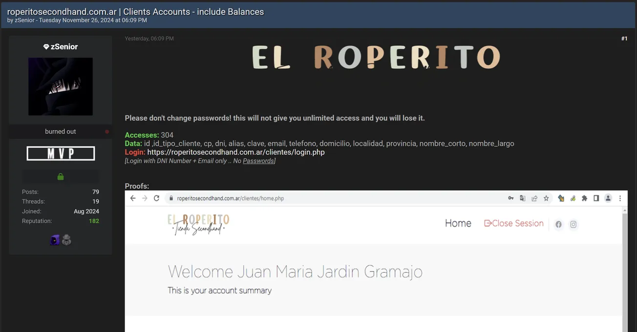 A Threat Actor is Allegedly Selling Access of El Roperito Tienda Second Hand