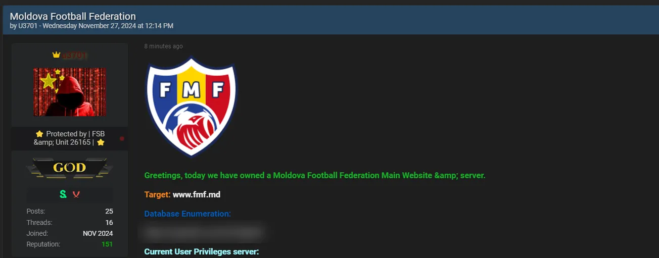 A Threat Actor is Allegedly Selling Access of Moldovan Football Federation