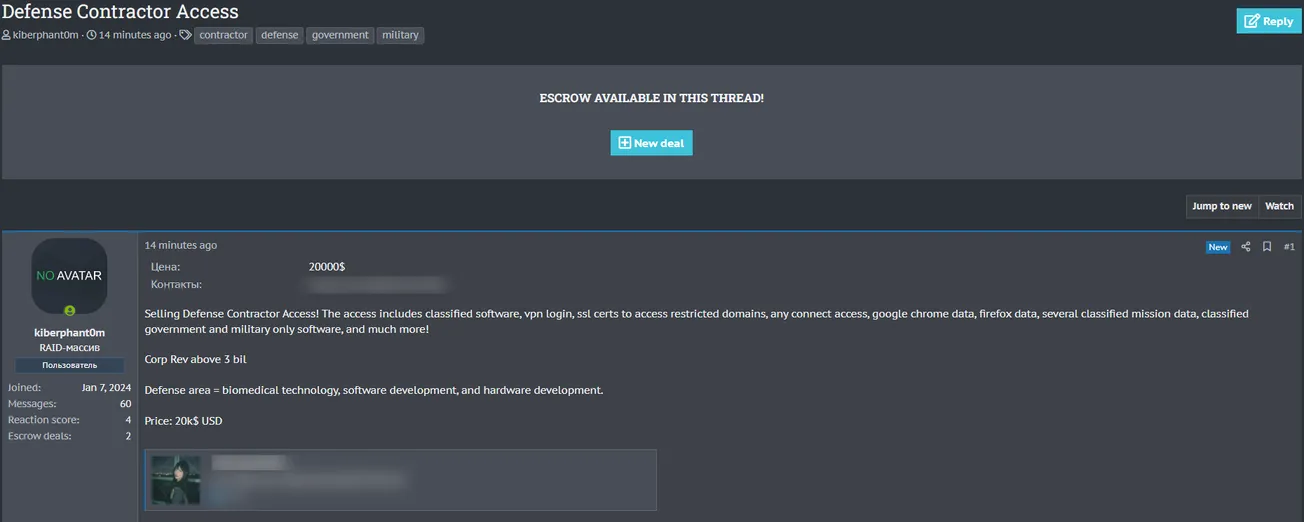 Selling Defense Contractor Access! The access includes classified software, VPN login, SSL certs to access restricted domains, AnyConnect access, Google Chrome data, Firefox data, several classified mission data, classified government and military-only software, and much more!