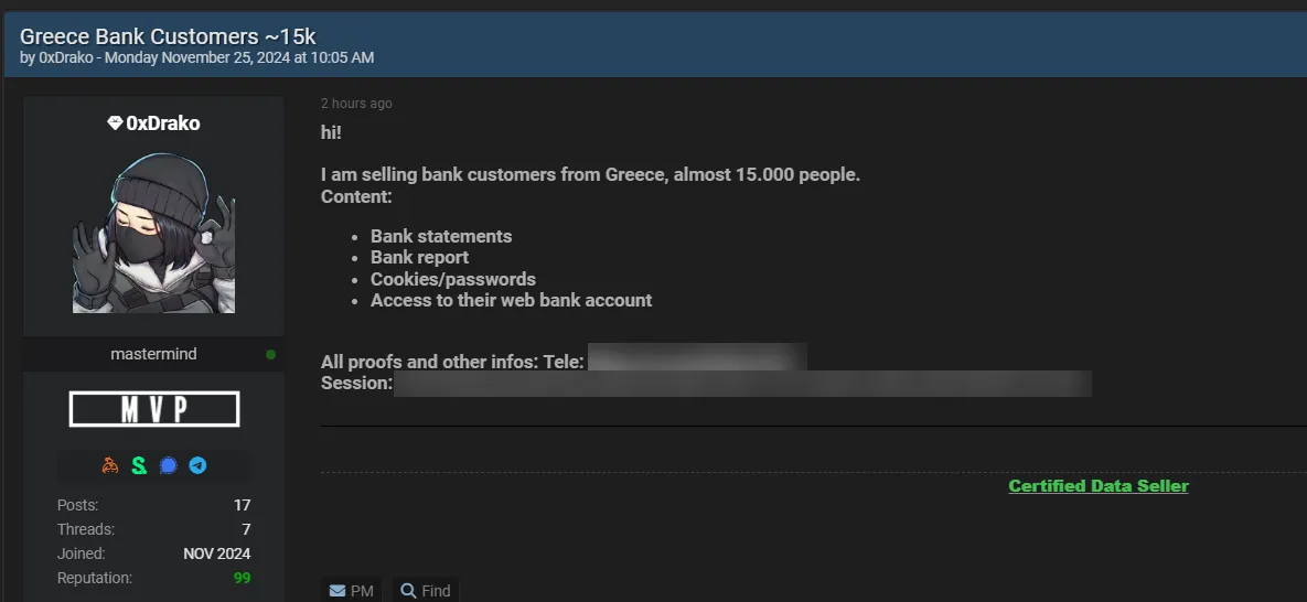 A Threat Actor is Allegedly Selling Access to a Greece Bank