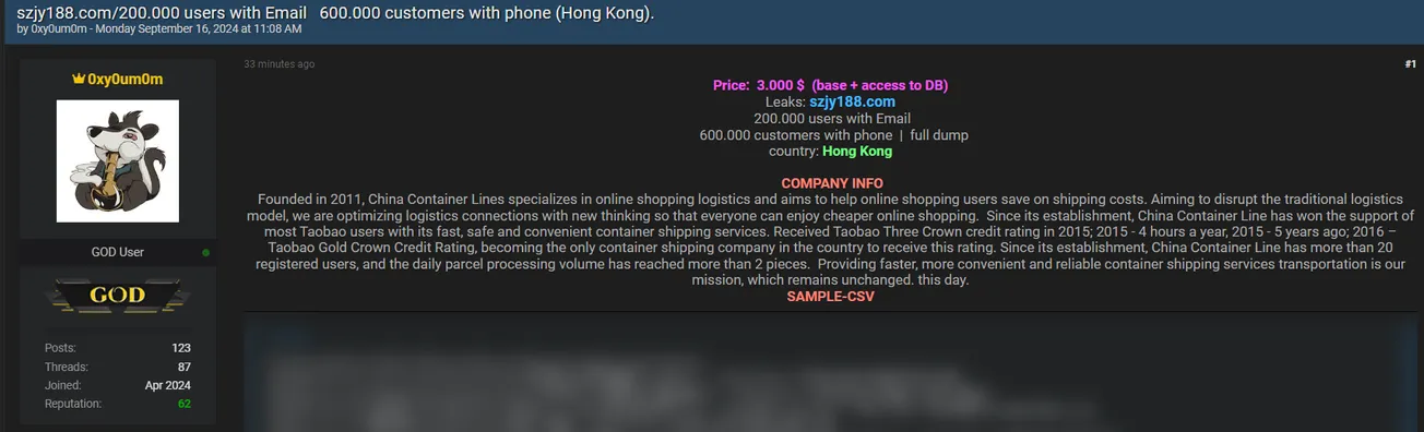 A Threat Actor is Allegedly Selling Access to a Shenzhen Freight Database