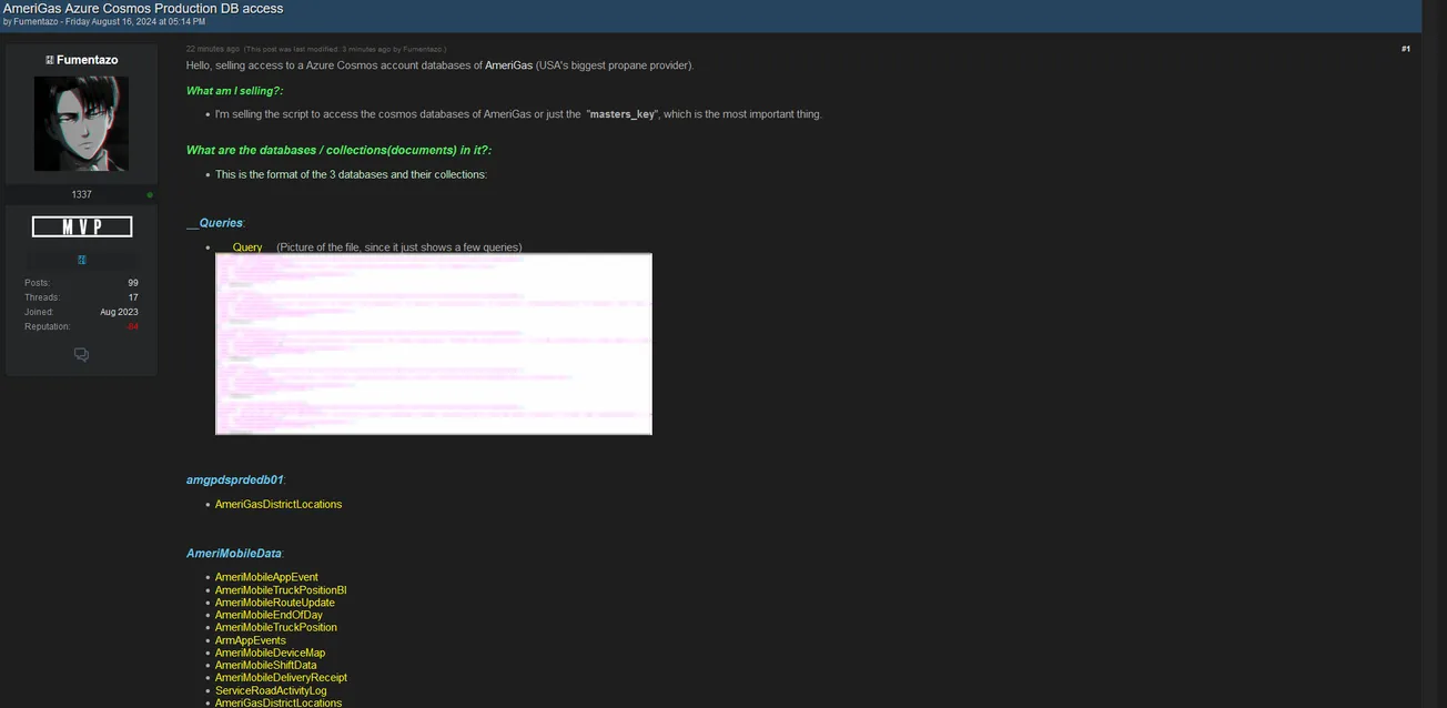 A Threat Actor is Allegedly Selling Access to AmeriGas Azure Cosmos Production Database