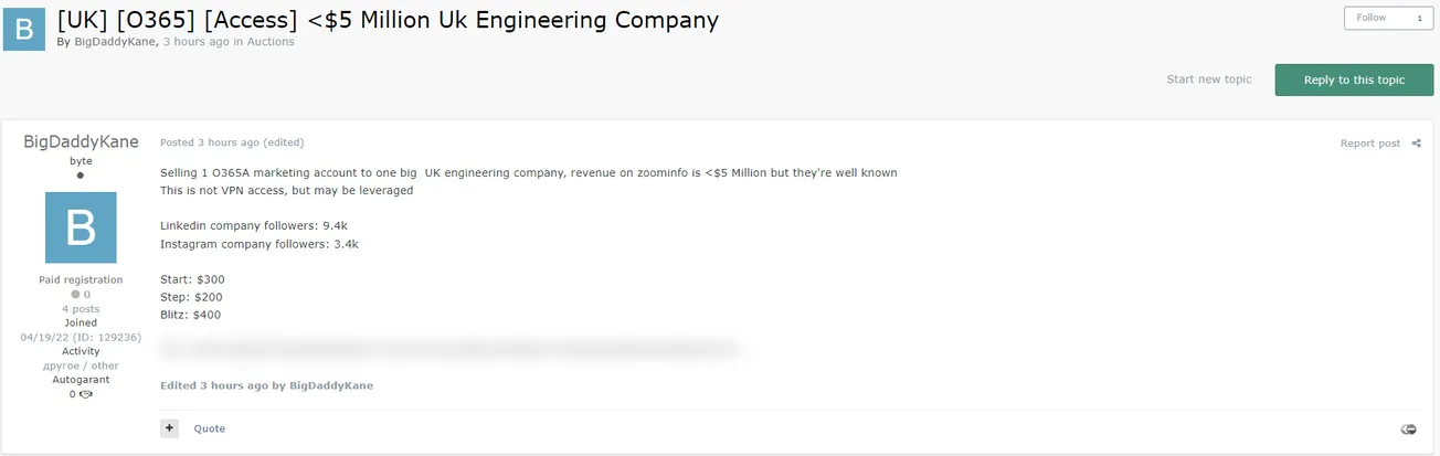 A Threat Actor is Allegedly Selling Access to an Office 365 Marketing Account of an Unidentified UK Engineering Company