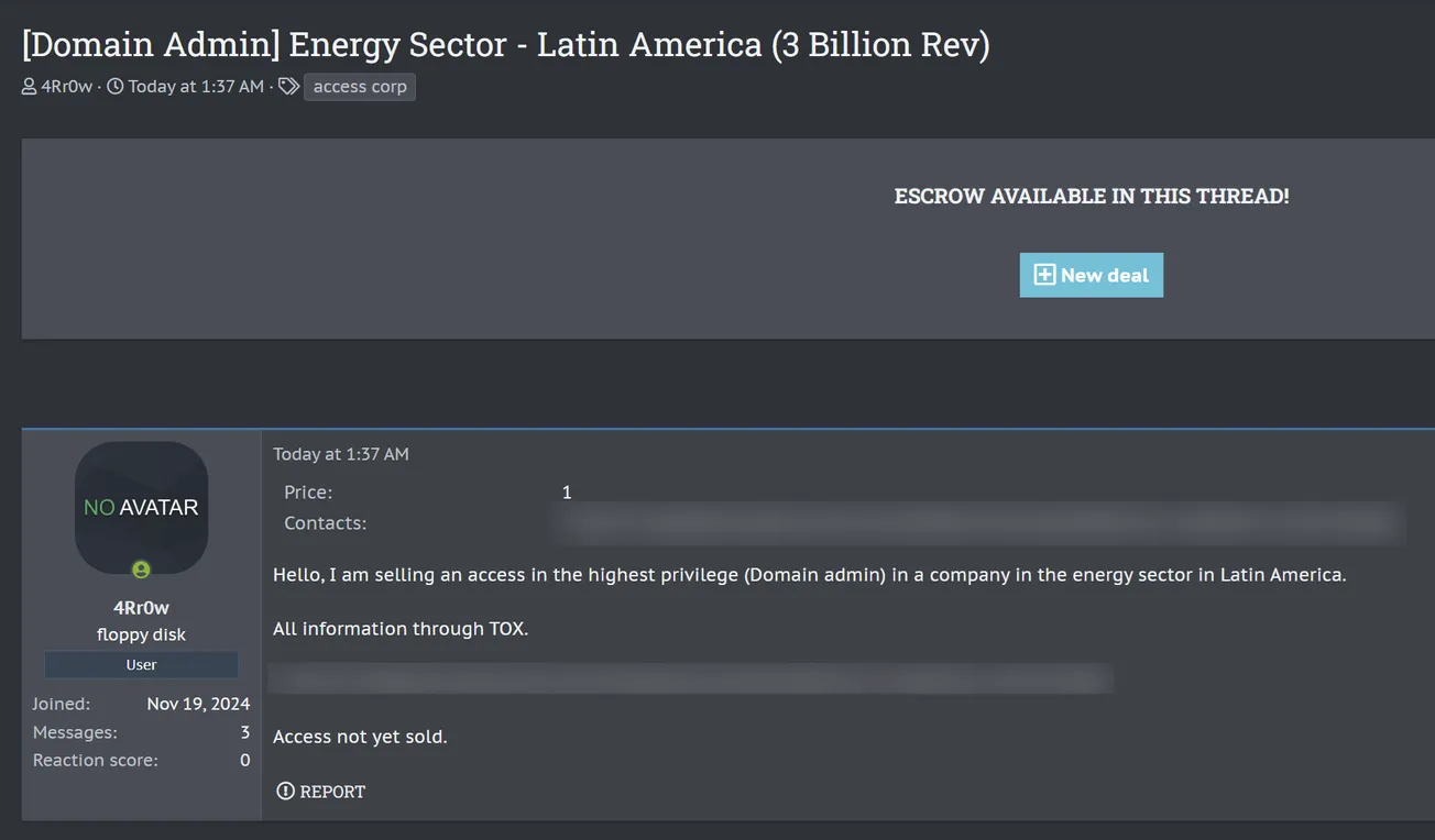 A Threat Actor is Allegedly Selling Access to an Unidentified Energy Company in Latin America With $3 Billion in Revenue