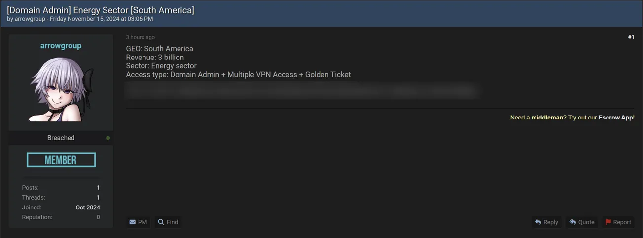 A Threat Actor is Allegedly Selling Access to an Unidentified Energy Company in South America