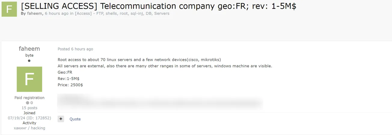 A Threat Actor is Allegedly Selling Access to an Unidentified Telecommunication Company in France