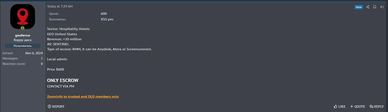 A Threat Actor is Allegedly Selling Access to an Unidentified US Hospitality Company