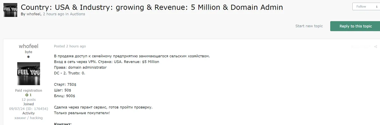 🚨A Threat Actor is Allegedly Selling Access to an Unidentified USA Company
