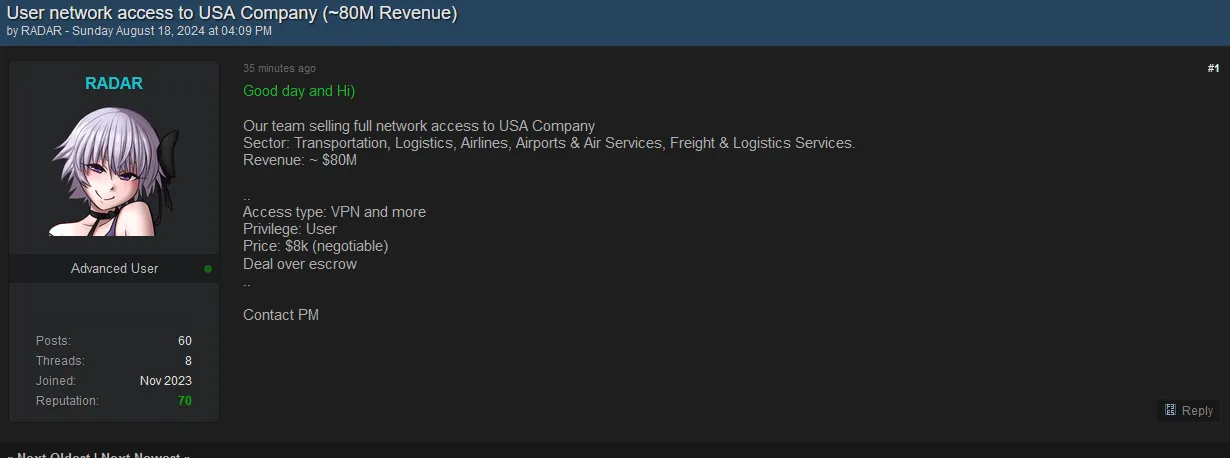 A Threat Actor is Allegedly Selling Access to an Unknown USA Company