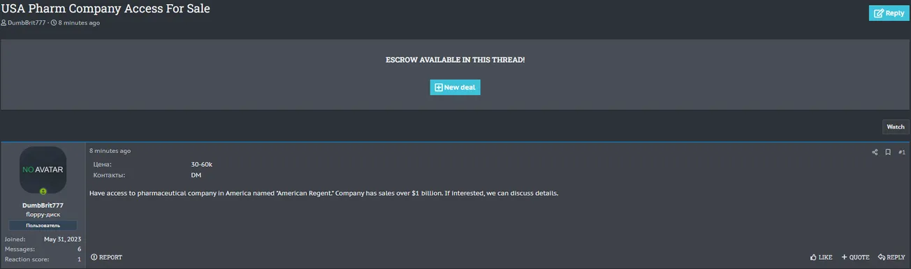 A Threat Actor is Allegedly Selling Access to an USA Pharmaceutical Company