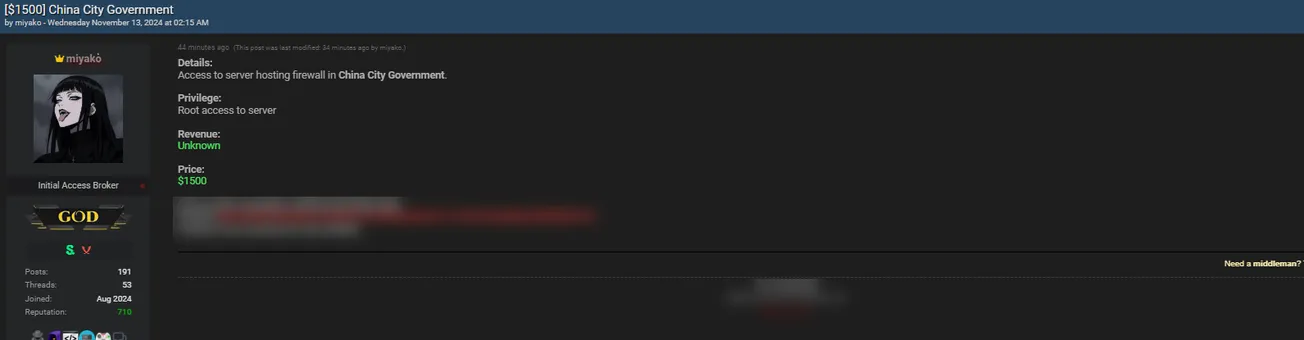 A Threat Actor is Allegedly Selling Access to Chinese City Government