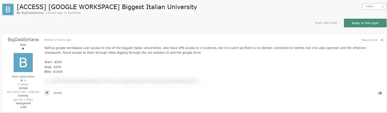 🚨 Title: Alleged sale of access to Google Workspace accounts belonging to one of Italy's largest universities