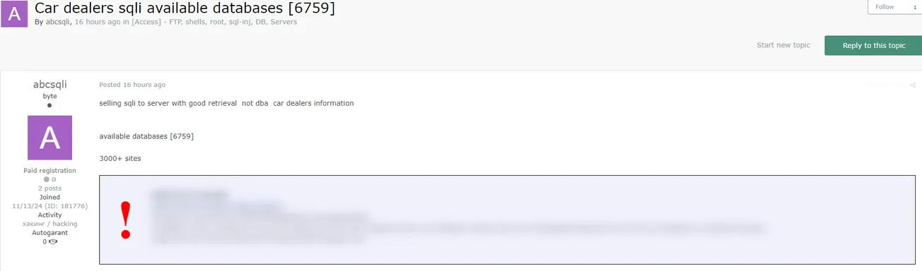 A Threat Actor is Allegedly Selling Access via SQLi Exploit to an Unidentified Server