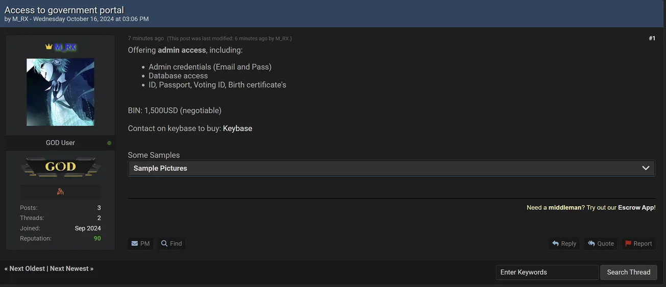 A Threat Actor is Allegedly Selling Admin Access to Government Portal of India
