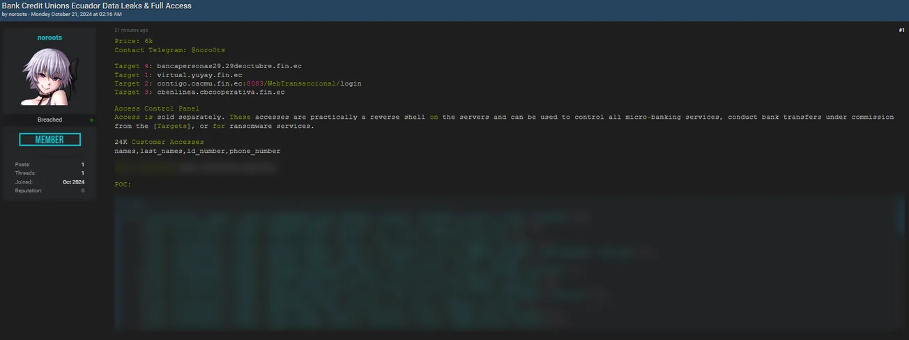 A Threat Actor is Allegedly Selling Data and Unauthorized Access to Multiple Credit Unions in Ecuador