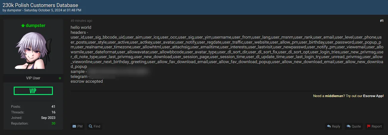 🚨 Title: Alleged sale of data from 230K Polish customers