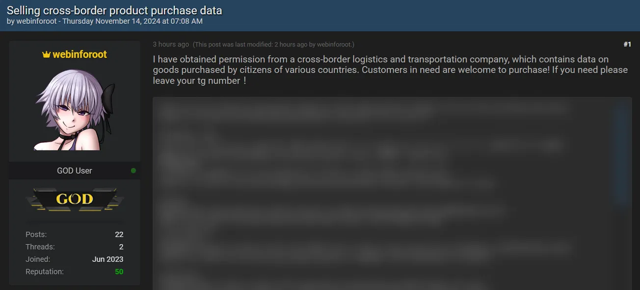 A Threat Actor is Allegedly Selling Data of an Unidentified Logistics and Transportation Company