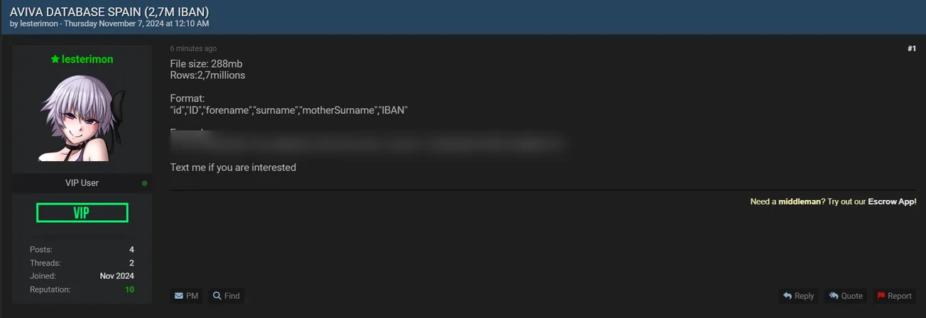 🚨 Title: Database of Aviva Spain allegedly kept for sale