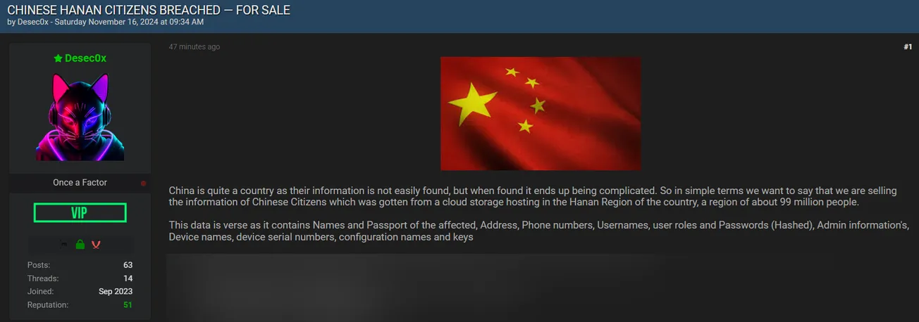 A Threat Actor is Allegedly Selling Data of Chinese Hanan Citizens