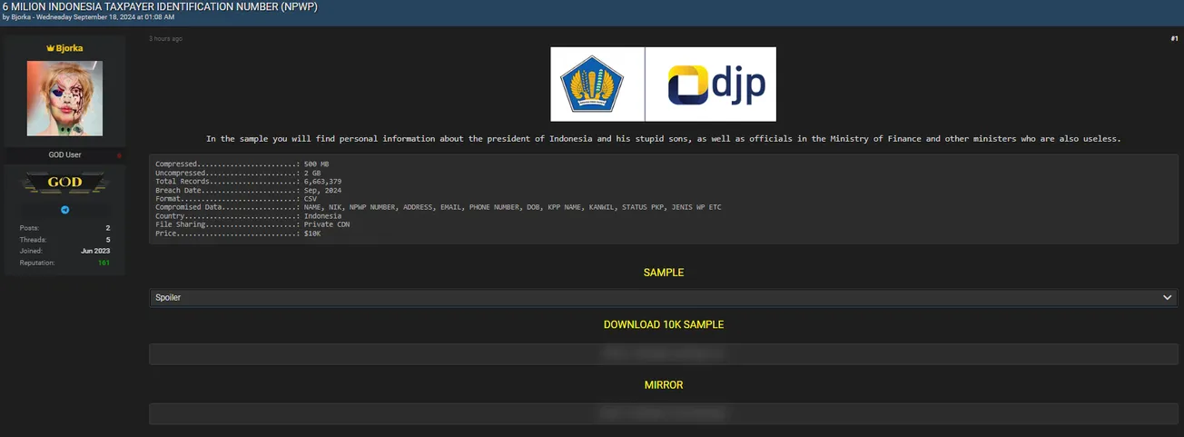 A Threat Actor is Allegedly Selling Data of Direktorat Jenderal Pajak