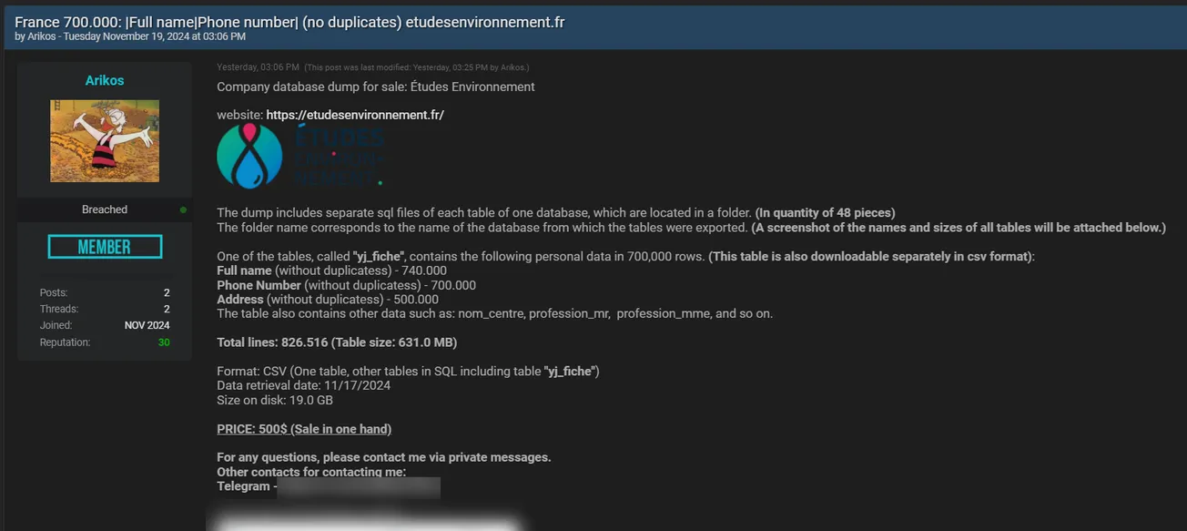 🚨 Title: Alleged database sale of Etudes Environnement