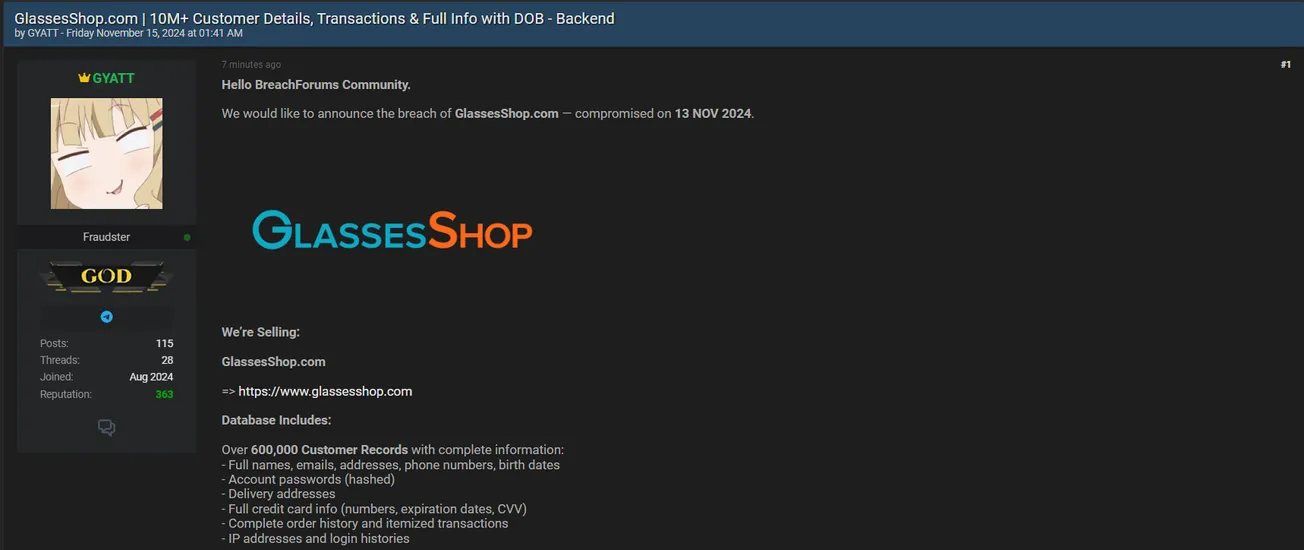 A Threat Actor is Allegedly Selling Data of GlassesShop
