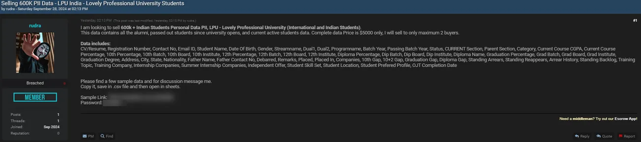 A Threat Actor is Allegedly Selling Data of Lovely Professional University