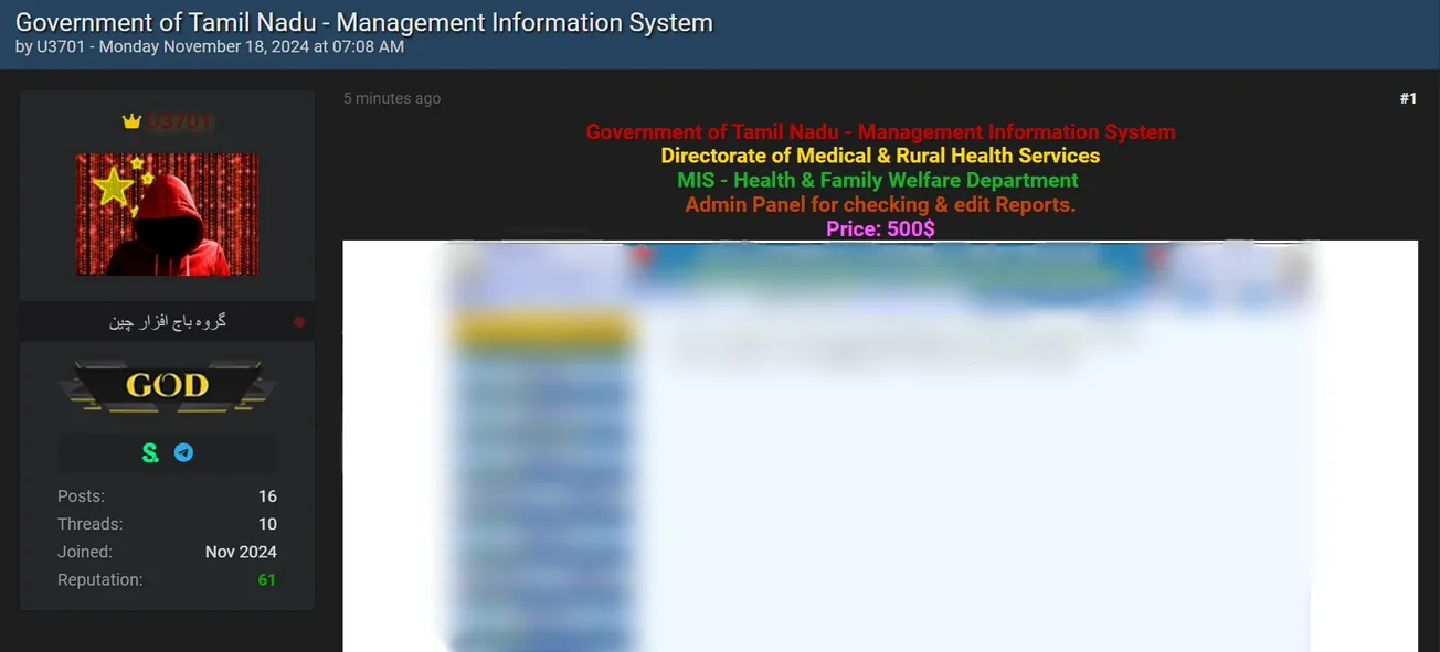 🚨 Title: Alleged database sale of MIS Tamil Nadu