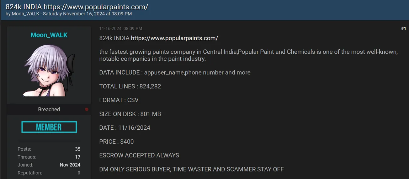 🚨 Title: Alleged data sale of Popular Paints and Chemicals