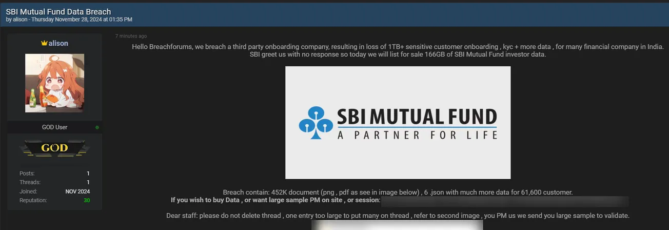 A Threat Actor is Allegedly Selling Data of SBI Mutual Fund