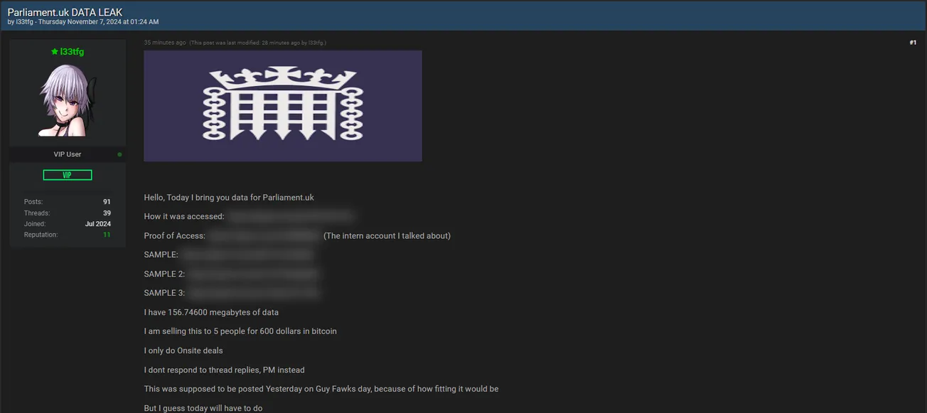 🚨 Title: Database of UK Parliament allegedly kept for sale