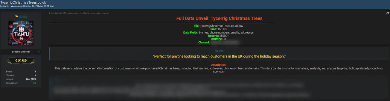 A Threat Actor is Allegedly Selling Data of Ty Cerrig Christmas Tree Farm