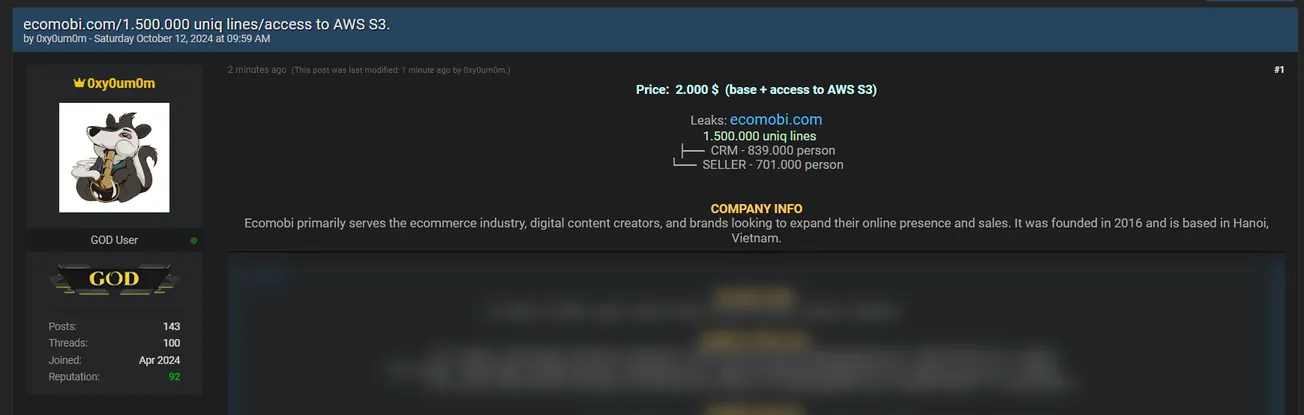 A Threat Actor is Allegedly Selling Database and Access to Ecomobi