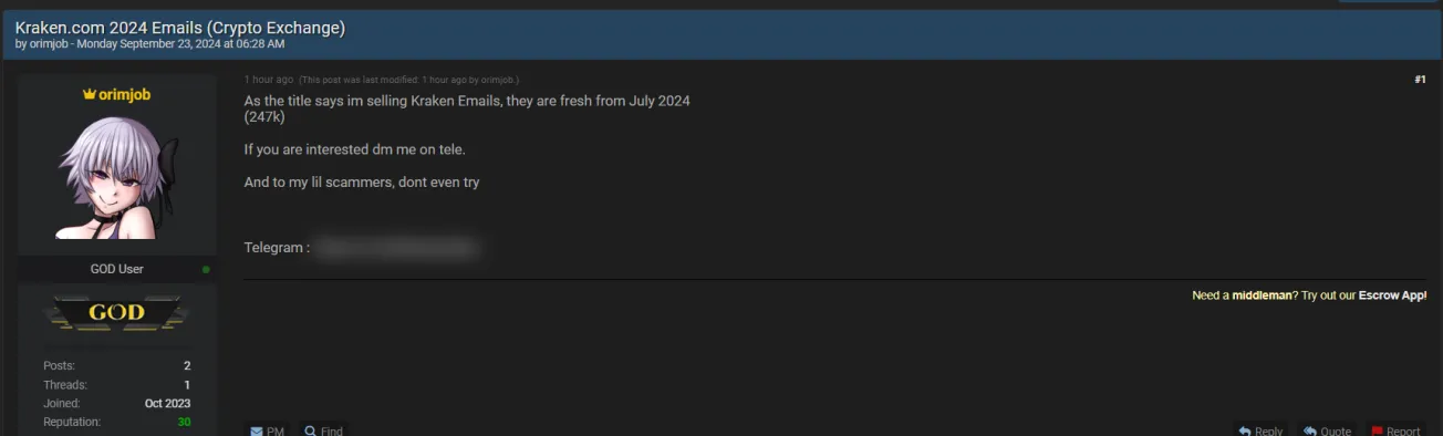 🚨 Title: Emails of Kraken allegedly kept for sale