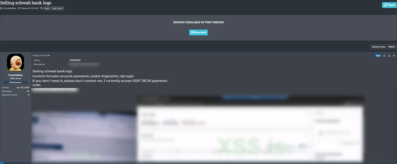🚨 Title: Alleged sale of log data from Charles Schwab Bank
