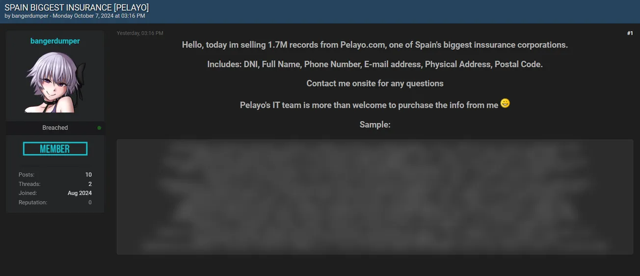 A Threat Actor is Allegedly Selling Pelayo Mutual Insurance Company data