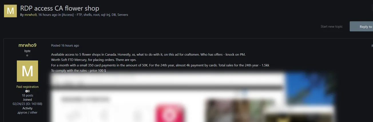 A Threat Actor is Allegedly Selling RDP Access to 5 Different Flower Shops in Canada
