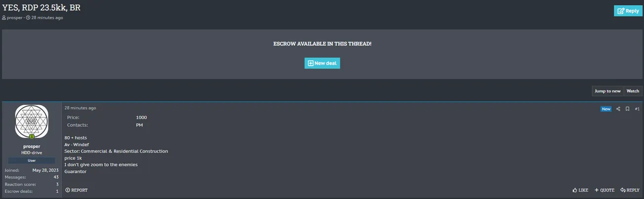 A Threat Actor is Allegedly Selling RDP Access to an Unidentified Brazil Company
