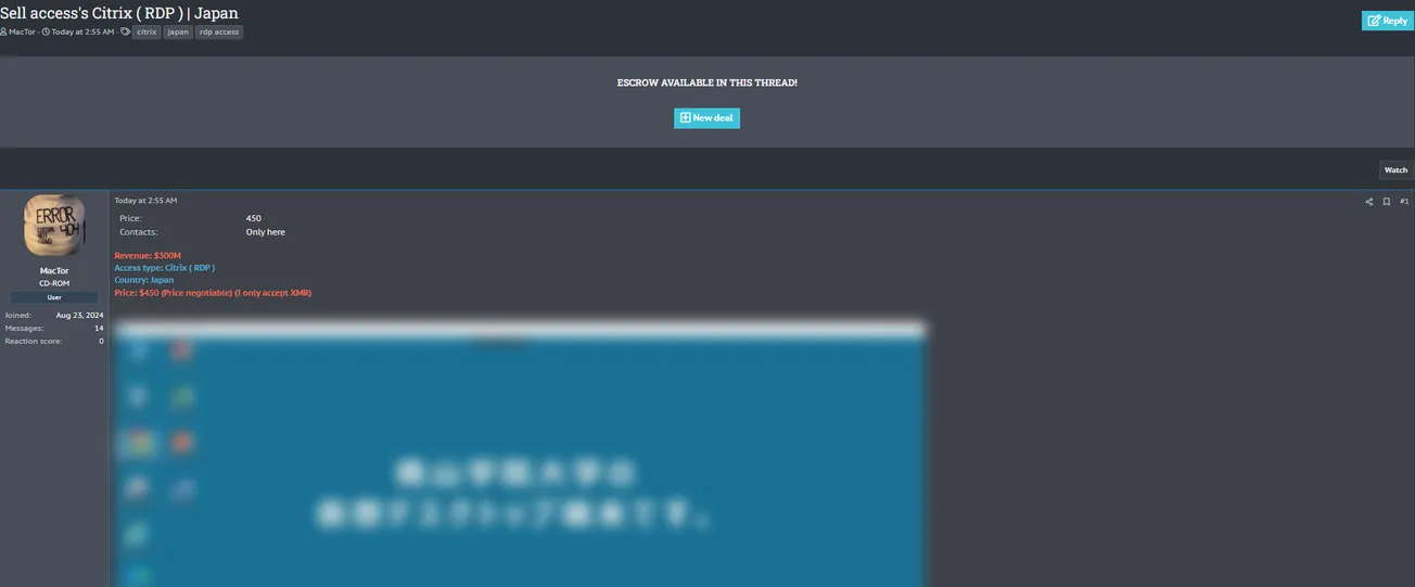 A Threat Actor is Allegedly Selling RDP Access to an Unidentified Company in Japan